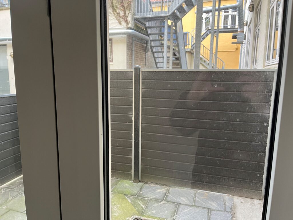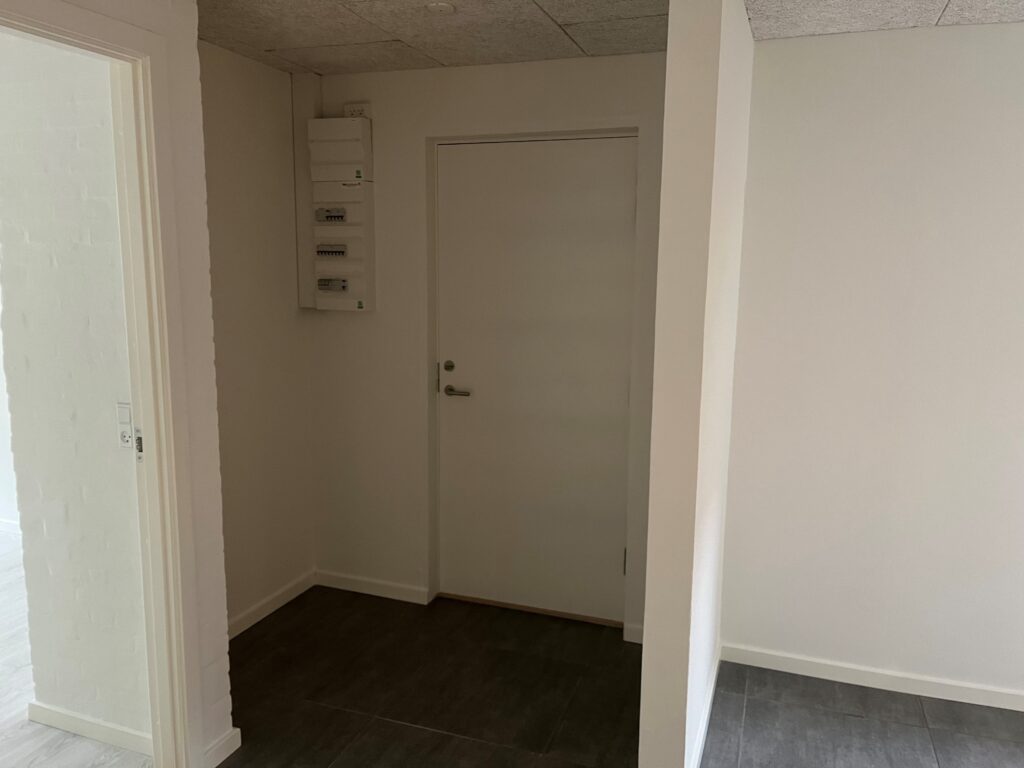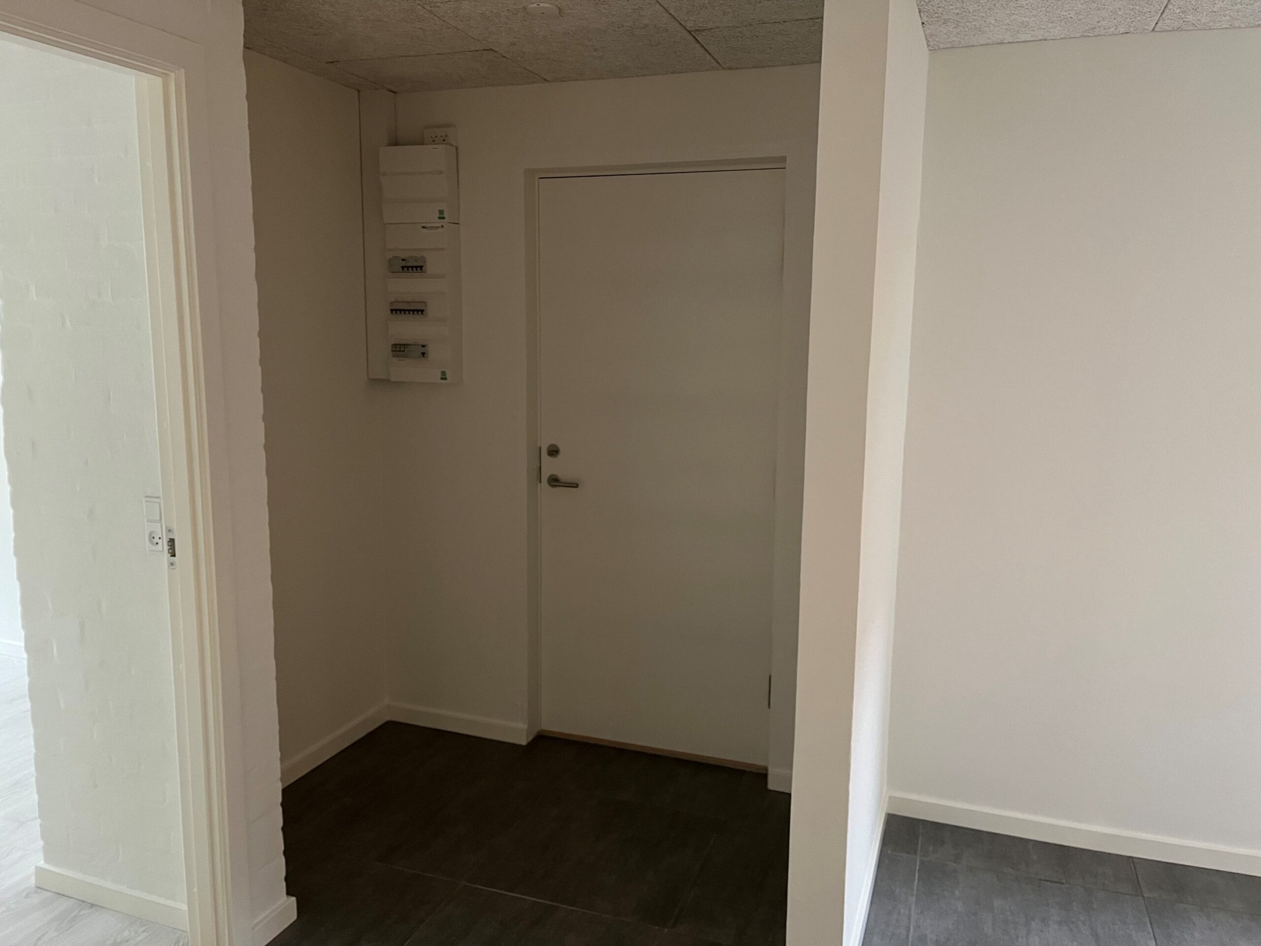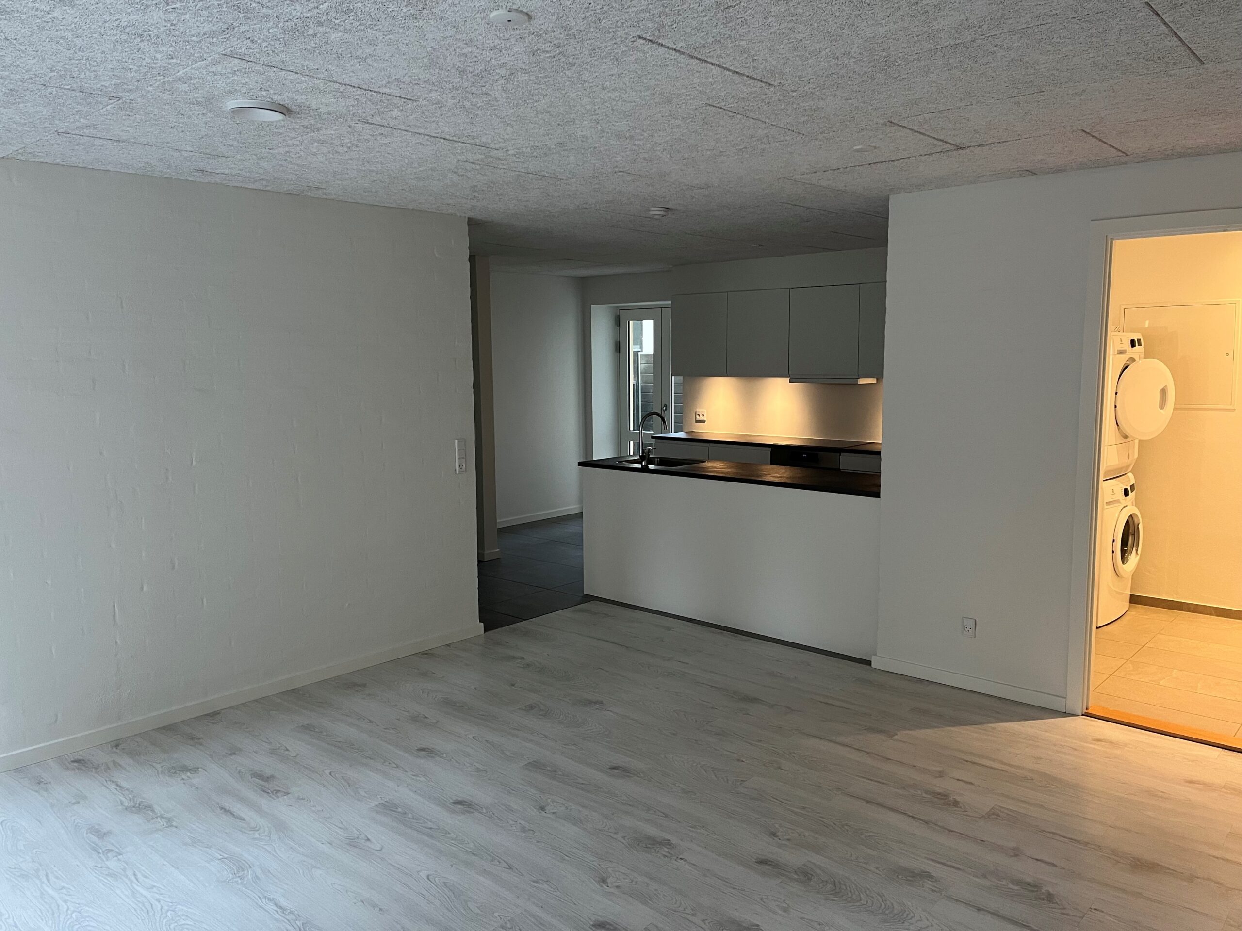 Lejligheden byder på en rummelig entré, der leder videre til et stilfuldt og rummeligt badeværelse, der er indrettet med separat bruser og vaskesøjle. Køkken og badeværelse er udført i tidløse, hvide elementer fra Designa, hvilket giver et moderne og minimalistisk udtryk.